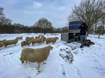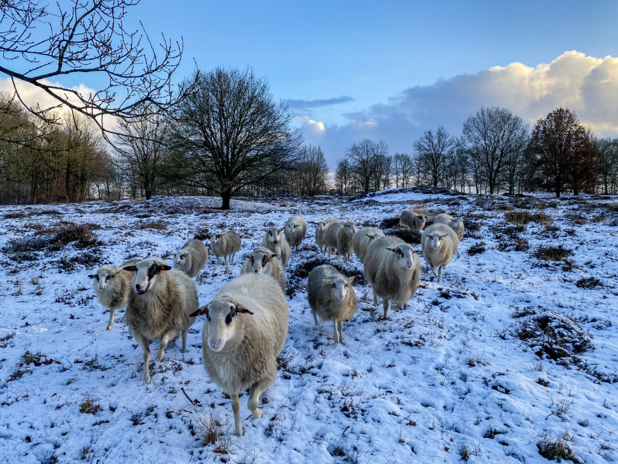 Der Winter hat das Emsland leider voll im Griff. Leider, weil er zu einem deutlich erhöhten Arbeits- und Kontrollaufwand führt. Die Schafe sind allerdings in der Lage, einen Teil ihres Futter unter dem Schnee zu suchen, indem sie Heide freischarren. Das Abfressen der im letzten Sommer zugewachsenen Heide im Winter ist ein wichtiges Element der Landschaftspflege, damit die Heide nicht überaltert.